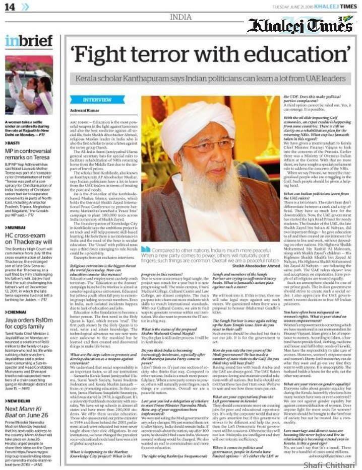 കാന്തപുരം ഉസ്താദുമായി ഖലീജ് ടൈംസ് നടത്തിയ അഭിമുഖത്തിന്റെ പൂര്ണരൂപം